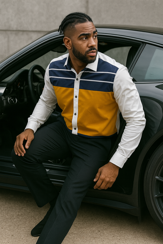 Fassonable Yellow Blue and White Pattern Long Sleeve Men's Shirt with Colorblock Design and Button Details