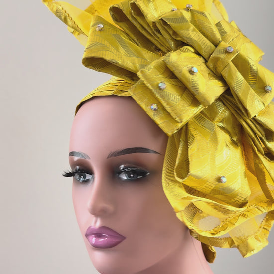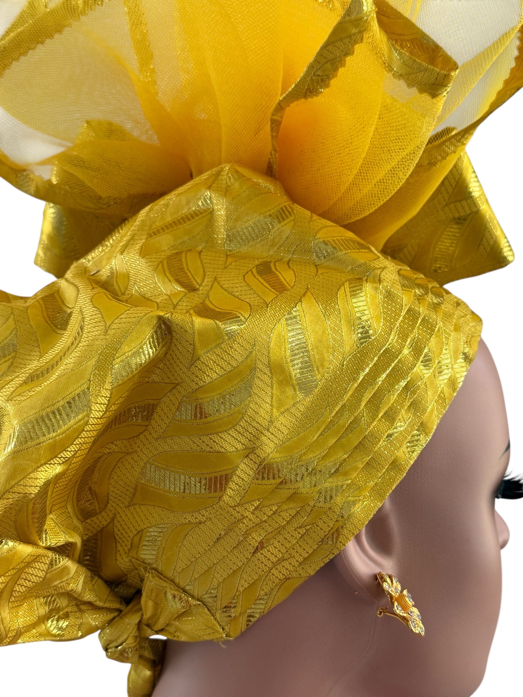 Elevate your traditional look with this stunning mustard yellow Sego auto Gele. Perfect for special occasions or everyday wear, this auto Gele is a beautiful piece of headwear that adds a touch of elegance to any outfit.