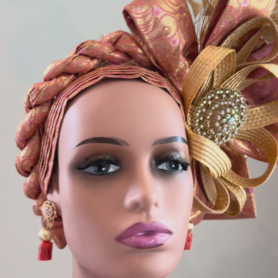 Make a statement with this beautifully embellished peach-colored Nigerian Autogele. Perfect for special occasions or cultural events.