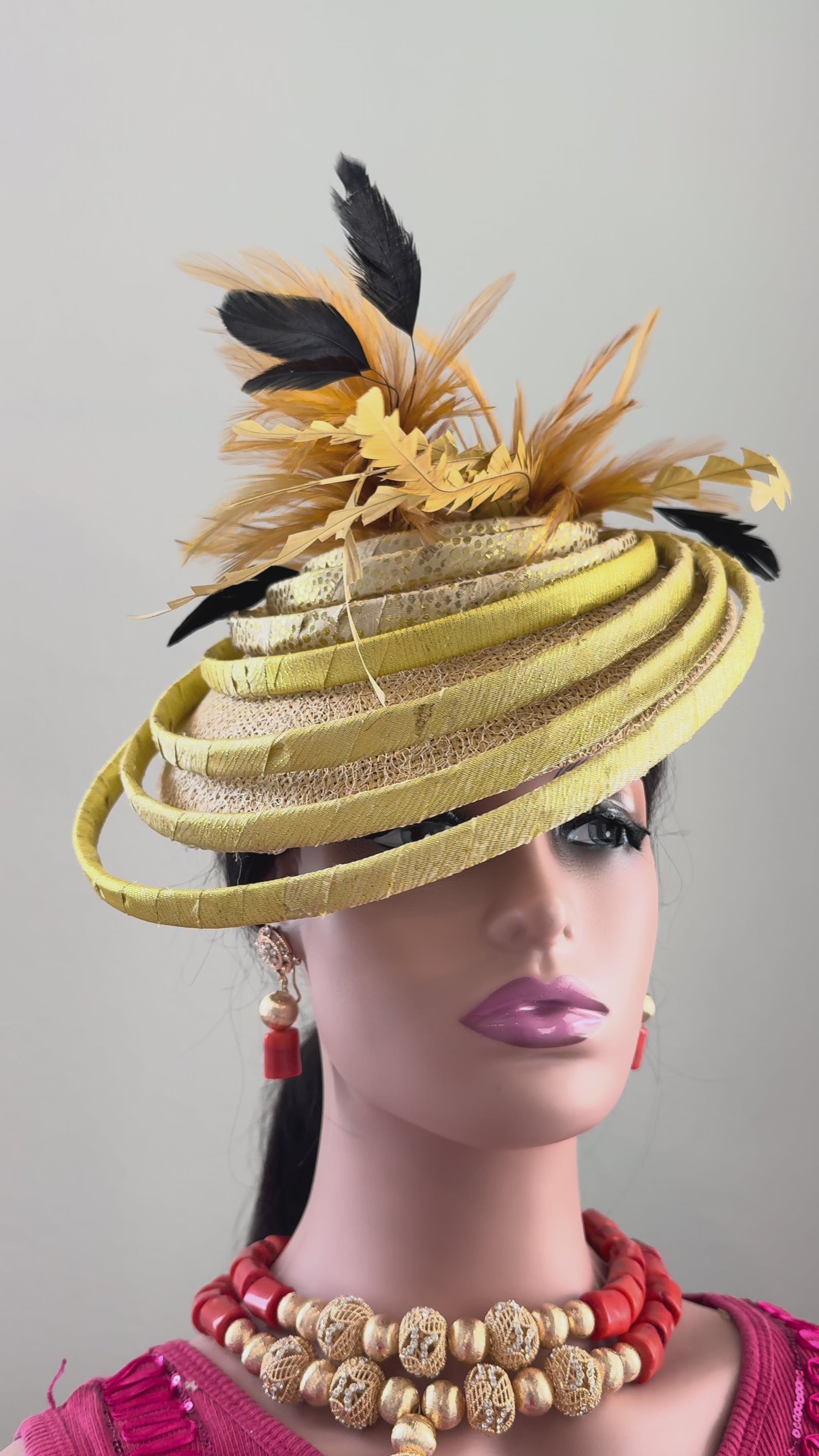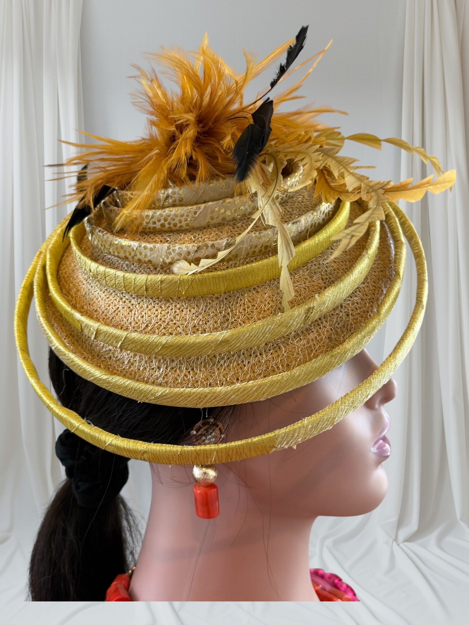 Elevate your style with this stunning gold-colored Nigerian Autogele featuring a unique ring-shaped design. Perfect for special occasions or cultural events.